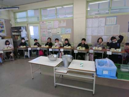 給食委員会の提案をもとにクラスで話し合った結果、感染症対策としておしゃべりはしないことを約束し、友達の顔を見ながら給食を食べる機会を設けることになりました。