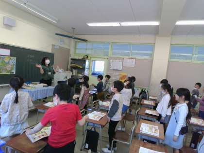 音楽は楽しむもの(2年生) 公開日 2023/04/11 更新日 2023/04/11 2年生 今年度は、2年生の音楽は専科の先生が教えてくださいます。今日、早速2年生は音楽の授業でした。「子犬のビンゴ」を手拍子などで楽しく歌いました。