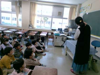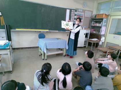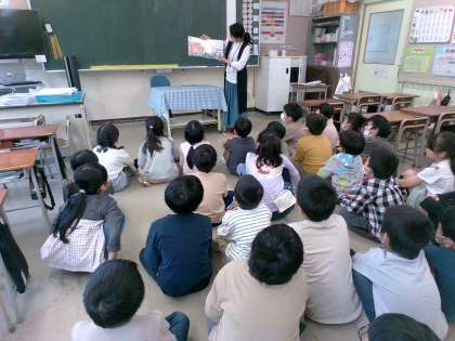 今日は読み聞かせでした。3組では、「きょうりゅうバスでがっこうへ」「たんぽぽ」を読んでいただきました。子供たちは真剣に興味深そうに聞いていました。次回も楽しみです。