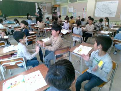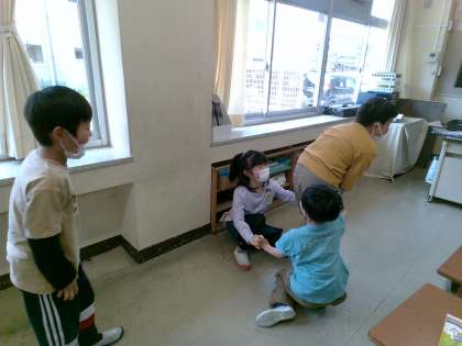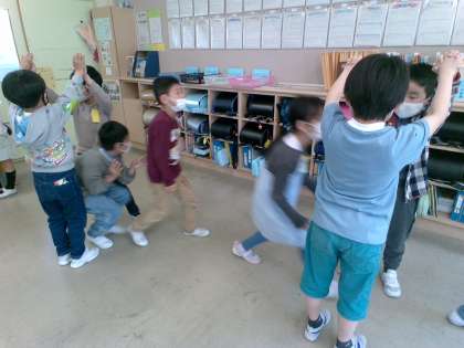 「はしのうえで」「こいぬのビンゴ」の曲で手拍子をしたり、体を動かしたりして楽しみました。今日は新しい「たぬきのたいこ」の曲に合わせて3拍子のリズムで手をたたきました。