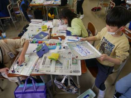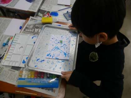 スパッタリングや吹き流しなど様々な技法を用いて夢模様をつくりました。つくった夢模様をさらに組み合わせて作品をつくりあげました。初めて出会う技法に心躍らせ、うれしそうに模様をつくる子供たちでした。