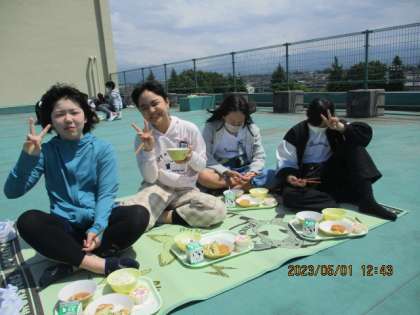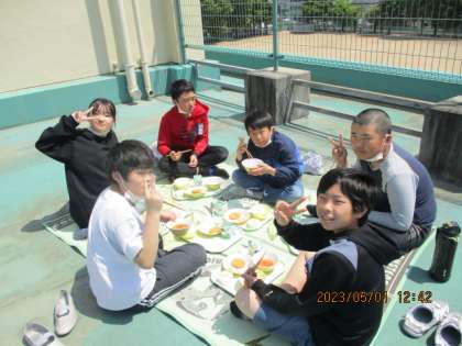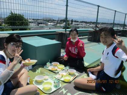 学級で実施したアンケートの結果を基に、屋上で給食を食べました。天気はよかったのですが、風がとても強かったです。しかしそんな中でも、子供たちの笑顔は輝いていました。