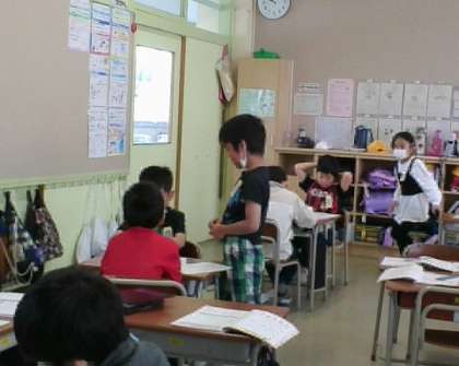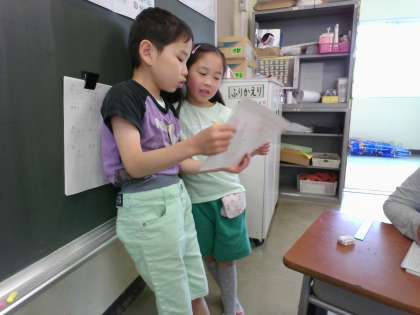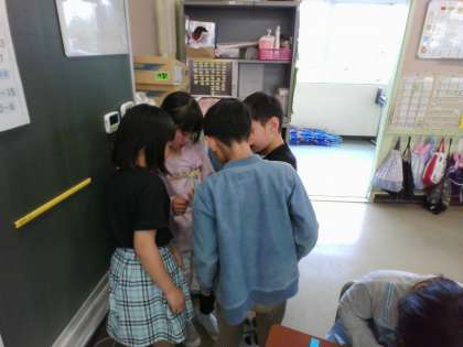 算数の時間で、ヒントカードを見ている子たちが「ここはこうするといいよ」「そうしたら、つぎはこうなるから」など、お話していました。また、別のグループで学習していた子は、他のグループの子にも話しかけています。