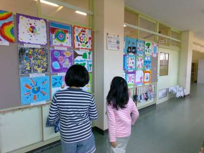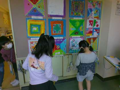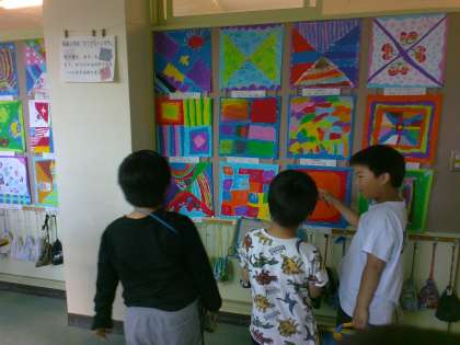 2年生は、図画工作科の学習ですてきなハンカチの絵を描きました。友達が描いた作品を見合い、よいところをたくさん見つけました。