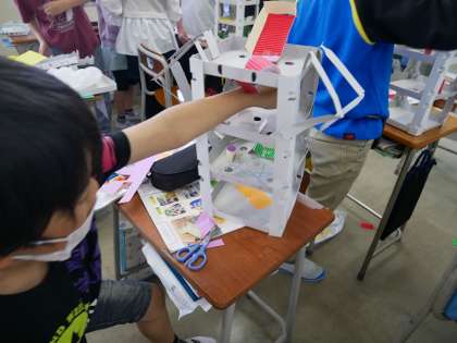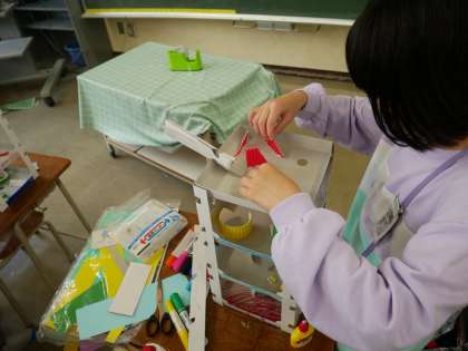 図工ではコロコロガーレという学習に取り組んでいます。ビー玉を4段の台でどのように転がすか、どのように落とすかを考えてつくっています。自分の中でテーマを決め、そのテーマに合わせてしかけやコースを考えたり、試す中で思いついたしかけやコースを考えたりと、楽しそうに活動に取り組んでいます。