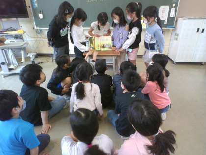 朝の学習の時間、ボランティアの方に読み聞かせをしていただいています。子供たちは、体を乗り出すようにして本の挿絵を見ながらお話を聞いています。また、読書係が休み時間を使ってクラスの友達に読み聞かせをしました。思わず笑ってしまうような楽しいお話で、読んでいる係の人も聞いている人も、みんな楽しい時間となりました。