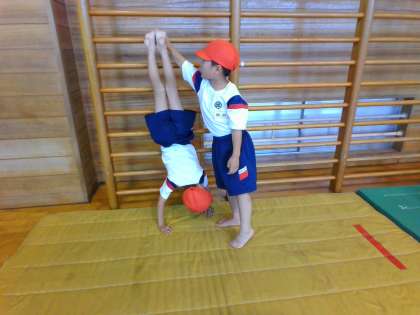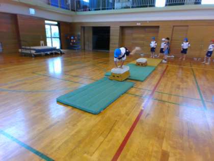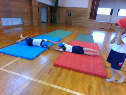 プールに入らない体育の日は、マットを使って、いろいろなコースの動きを楽しんでいます。
