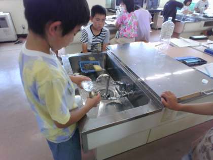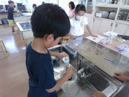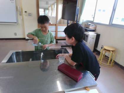 算数で1dLますを使って、水のかさを調べる活動をしました。家から持ち寄った水の入れ物に水を入れて、1dLます何杯分かを数えました。
