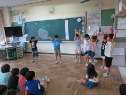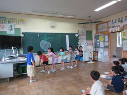 1年生は「おおきなかぶ」の学習をしています。友達と声の大きさや動きを工夫しながら音読劇をするなど、お話を楽しんでいます。
