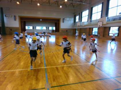 体育の時間に、子供たちがやりたいと言ったドッジビーやしっぽとりゲームをしました。体を動かす運動遊びが大好きな子供たち。暑い体育館でも、元気に活動しました。