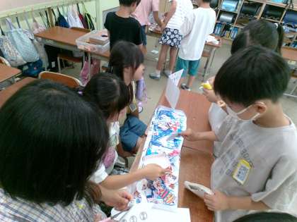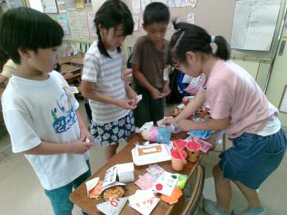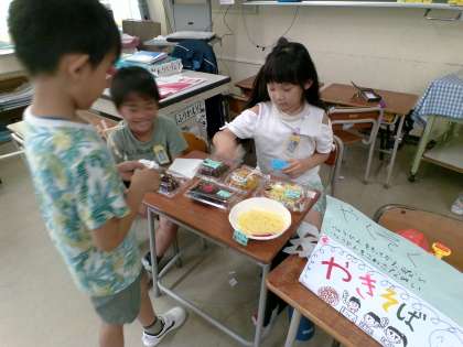 3組では、1学期終わりに「みんなで夏まつりしゅう会」をしました。グループにわかれて夏まつりのお店をつくり、お店やさんごっこをして楽しみました。また、くじや、宝探しゲームも行いました。子供たちの工夫がたくさん見られ、楽しい集会になりました。