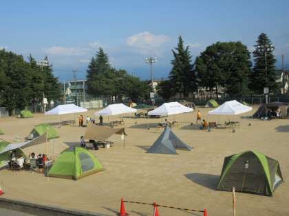 蜷川小学校のグラウンドいっぱいに、色とりどりのテントが張られ、学校がキャンプ場になったようです。
