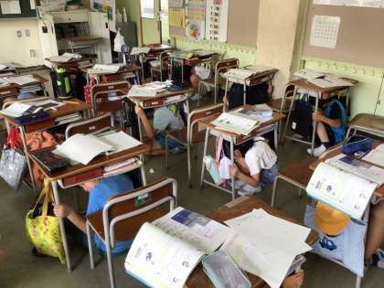 9月1日は防災の日ということでシェイクアウト訓練が行われました。まず低く、頭を守り、動かないの基本姿勢を確認し、実際に地震があった想定で訓練を行いました。子供たちは真剣に取り組み、様々な場面で地震が起きたときの対応についても考えました。