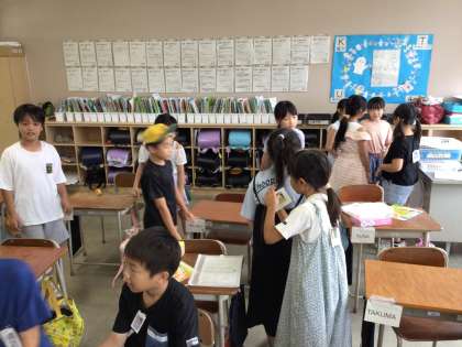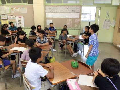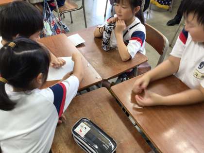 2学期から朝の活動を学習タイムではなく、言語活動や学級遊びの時間としています。文字を美しく書こうとみんなで協力したり、文字数の制限のあるしりとりで言葉をつないだりしています。協力するよさを感じ取りながら活動に取り組んでいます。