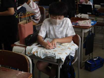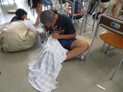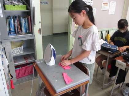 家庭科では、家にあるいらなくなった布を使ってトートバッグや巾着、ティッシュケース等をリメイクしています。自分が作りたいもののイメージを膨らませながら、自由進度で学習に取り組んでいます。