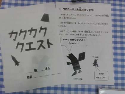 図形の学習は、「カクカククエスト」という物語を想定して行います。子供たちが勇者となり、カクカク大魔王を倒すというストーリーです。(これは学習発表会まで続いていくストーリーです)