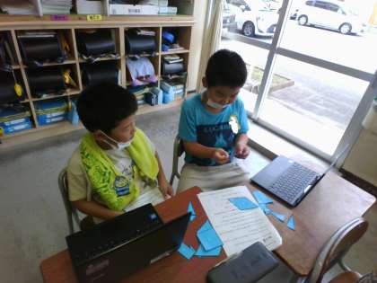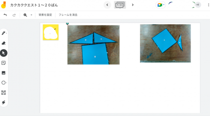 子供たちは今日、図形のパズルで勇者の家などを作りました。作ったパズルはジャムボードで共有しました。
