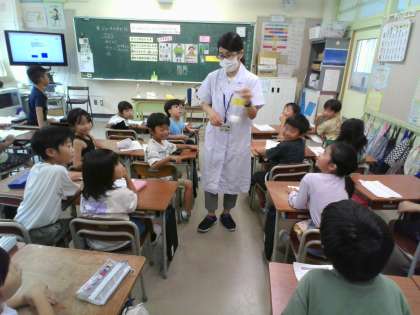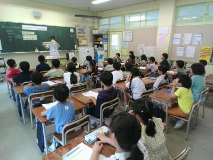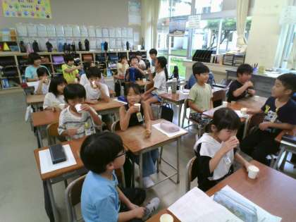 栄養教諭の和田先生から、飲み物に入っている砂糖のはたらきについて教えていただきました。子供たちは、普段飲んでいるジュースの中には多くの砂糖が入っていることを知り、これからの飲み物のとり方について考えました。