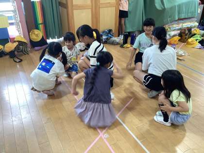 活動中は、子どもたちに積極的に声をかけたり、一緒に楽しみながら全力で遊んだりする姿がよく見られました。年齢が低い子どもたちにも、年齢に合わせた関わり方でふれ合いを楽しんでいました。