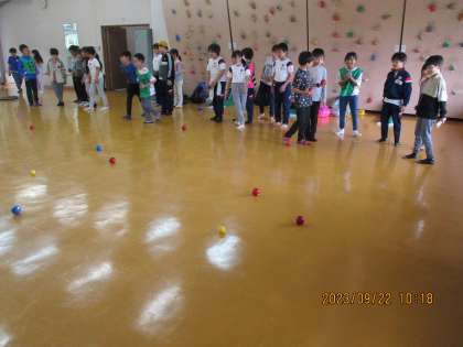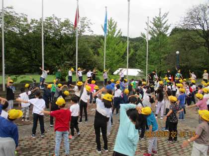 宿泊学習2日目。子供たちは朝からふとんやシーツの片付けを友達と協力して行いました。そして朝の集いではラジオ体操をしたり「今日のめあて」を発表したりしました。その後、ペタンクやザリガニ釣りなどをして楽しみました。