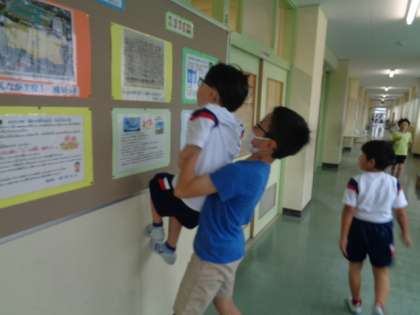 掲示板に貼られていた写真を見ようとしていた低学年の子供がいました。でも、上の方に貼ってあるので見ることができません。そのとき、そこを通りかかった6年生の子供がなんとだっこをしてあげたのです。低学年の子供は、写真が見れた喜びと、だっこしてもらったうれしさを感じながら教室へと戻っていきました。
