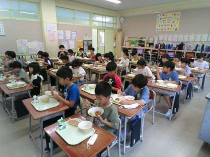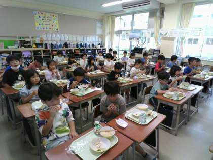 今日の給食は、シチュー、ハンバーグ、サラダでした。子供たちは前を向いて静かに食べています。
