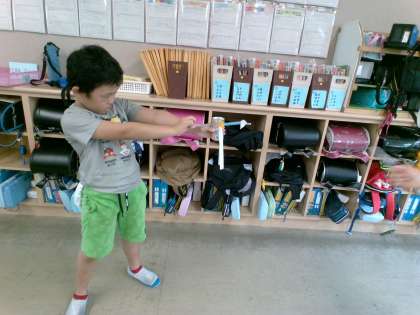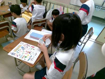 生活科の時間に「つくってあそぼう動くおもちゃ」という学習をしています。教科書や本を参考にしながらつくりたいおもちゃを決め、材料を家からもってきてつくりはじめています。「うまく動いたよ」「もっと遠くまでとばないかな」と子どもたちなりに工夫しながらすすめています。