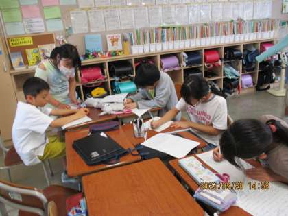 国語科「事実を分かりやすくほうこくしよう」の単元で、宿泊学習の新聞作りを行っています。事前に「どんな宿泊学習になるとよいか」をグループで話し合い、実際に体験したことから新聞の内容を決めて仕上げます。「割り付け」では、一番大きく取り上げたい内容と、その他の内容のバランスを考え、必要な記事の大きさ、絵や図、写真の大きさ等、みんなで話し合って決めました。一人一人が責任をもって記事を担当します。出来上がりが楽しみです。