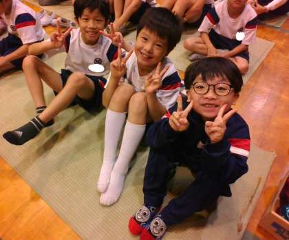 他の学年の発表に、2年生は大満足でした。 楽しくて、思わずピースサイン。