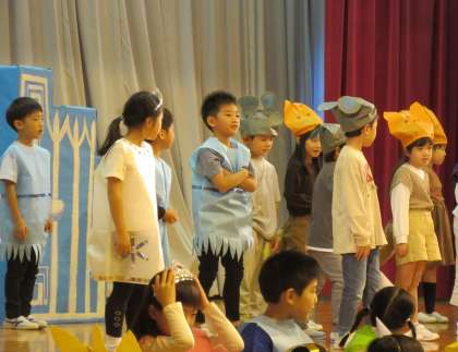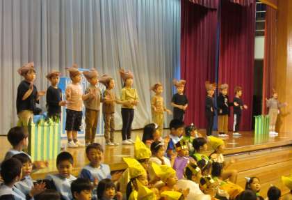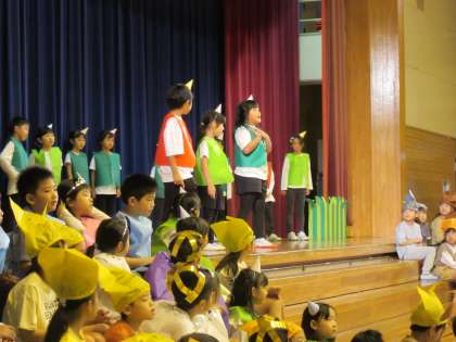 今日は、校内発表会がありました。1年生の子供たちは、「大きな声で」「はっきりと」「表情をつけて」等、今まで練習してきたことを発揮して、堂々と演技しました。役に合わせた衣装がとても似合っていました。