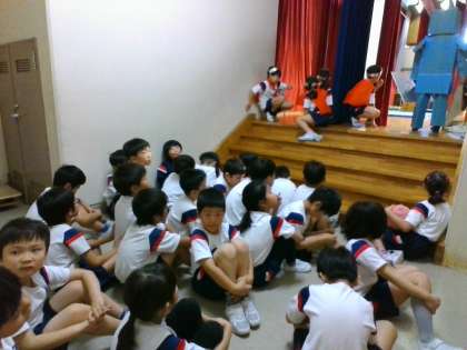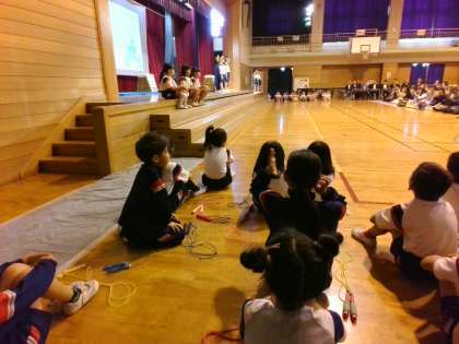 子供たちは自分の出番でなくても、「静かに応援しようね」「カクカク大魔王の着替えを手伝ってあげなくちゃ」「ここはなわとびの人たちが通るから、どいてあげよう」など、これまでの練習で身につけたことを実行していました。