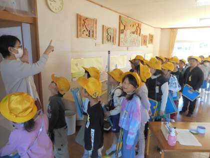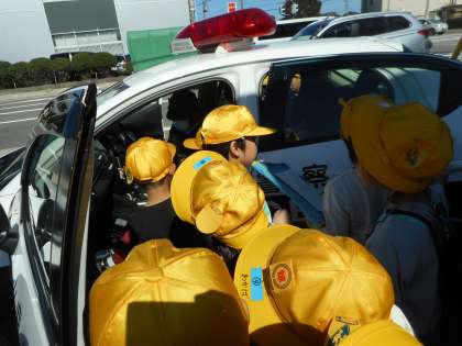 今日は生活科の学習「まちたんけん」で二度目の校外学習に行きました。ピンク・紫コースは、藤園南幼稚園、蜷川児童館、下堀交番の三箇所を訪問し、たくさんインタビューしました。施設の仲を見学させていただいたり、パトカーの座席に乗せていただいたりするなど、子供たちは貴重な経験ができました。
