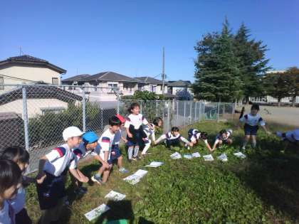 国語科では、「くじらぐも」の学習をしています。場面のようすを想像しながら音読するために、実際に外へ行って手をつなぐことや、輪になることを教科書から確認し、「天までとどけ、1、2、3」と言ってとんでみました。「心を一つにしないと!」と、大盛りあがりでした。