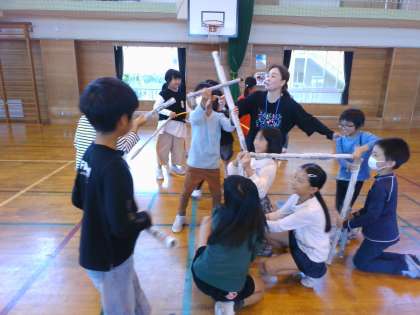 劇団あとむの方をお招きし、新聞紙の棒を使った表現活動を体験しました。