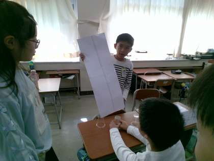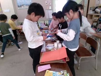生活科の時間に、動くおもちゃづくりをしています。今日はつくったおもちゃを持ち寄り、それぞれがお店を開いて友達にも遊んでもらいました。振り返りでは「めもりをつける工夫がしてあって、どのくらいとんだか分かりやすかったよ」「点数があったから楽しかったよ」とたくさんの楽しませる工夫が出できました。
