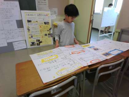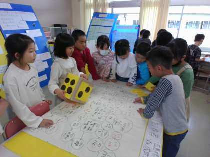 すごろくや巻物、ポスターなど、工夫をこらしたものばかりで、2年生は楽しそうに蜷川の歴史にふれることができました。