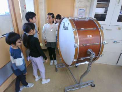 前の時間に出た「音が大きいときと小さいときでは、物のふるえ方はちがうのだろうか」という疑問について、実際に音を出してみて調べました。「同じ楽器を使って大きい音と小さい音を出せば分かると思う」と考え、それぞれのグループで調べたい楽器を決めて取り組みました。