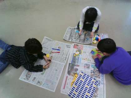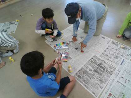 こまづくりグループでは、丸太を切って作られたこまにマジックで模様をかき、中心に軸を通して木のこまを作りました。回してみると、どのこまもカラフルに見え、子供たちはとても楽しそうでした。