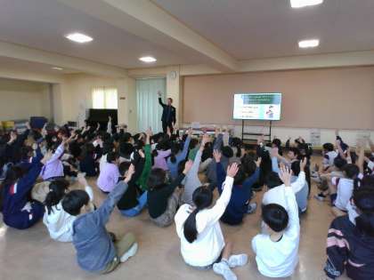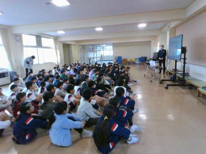 中央警察署の少年サポートセンターの方をお招きして、「くもくん教室」を実施しました。水着で隠れる部分をプライベートゾーンといい、自分だけの大切な場所であるということを学びました。