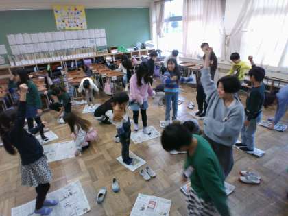 国語の「はんで意見をまとめよう」では、お楽しみタイムでしたいことを班ごとに話し合って決めました。今日は6班の担当で、新聞じゃんけんを楽しみました。