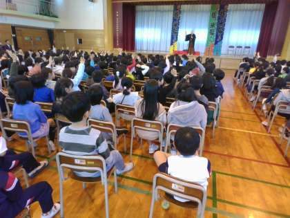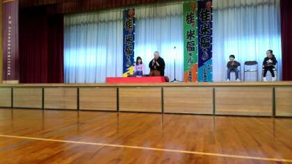 3時間目に「落語教室」を行いました。代表の子供が、講師の桂米福さんから落語の仕方を教わり、みんなの前で体験しました。その後、米福さんの落語を聞き、体育館はたくさんの笑いに包まれました。