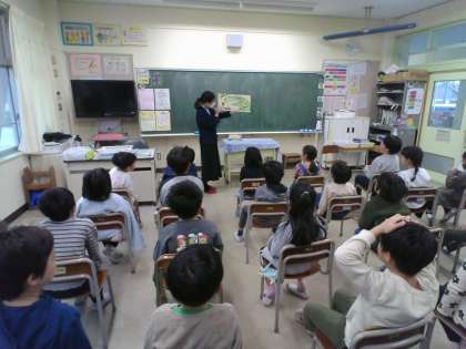 蜷川分館の図書館司書2名をお迎えし、ストーリーテリングとブックトークをしていただきました。「はやい」「おそい」をテーマにした読み聞かせは、子供たちも興味を持って聞き入っていました。蜷川分館の皆様、素敵な時間をありがとうございました。