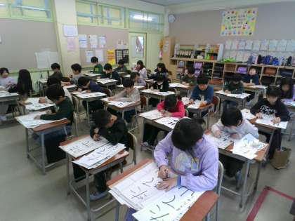 国語科では、書初の練習をしています。今年の2年生の課題は「たて山」をクレヨンで書くことです。子供たちは、手本をよく見ながら、姿勢を正して丁寧に書いていました。
