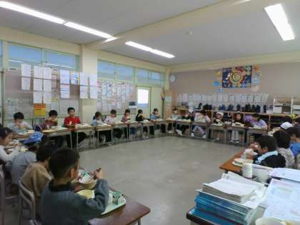 2学期の給食最後の日だったので、子供たちの発案で、机を輪にして食べました。それだけでも大喜びでした。