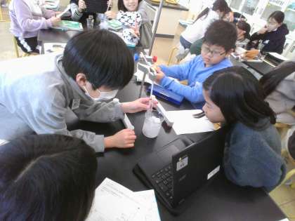理科では、水のすがたの変わり方について、学習しています。今日は、水が冷えて氷になるとき、温度や水のようすがどのように変化するのか調べました。初めて凍っていく様子を間近でみて、子供たちはたくさんの気付きをもちました。「0度近くになると凍りはじめたよ」「0度になると、温度がなかなか変わらないよ」「凍りが白くなっていったよ」と、目を輝かせながら気付きを話してくれます。このあとの実験も楽しみです。