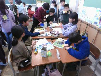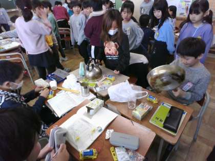 どんな物が電気を通すのか調べる実験をしました。クリップやアルミ缶、スチール缶、やかん、氷など、それぞれが調べたいものを用意してやる気満々。アルミ缶の側面は電気を通さなかったけど、印刷をやすりで削ると電気を通すということに気づき、その理由をみんなで考えました。