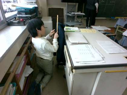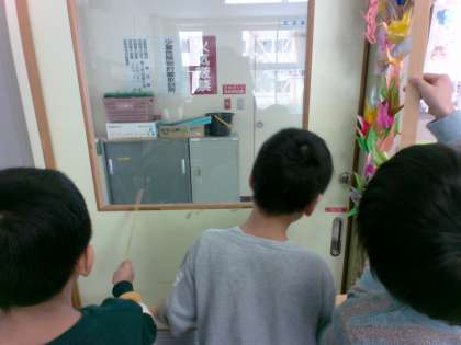 算数の時間に、1mだと思うものを予想して実際に測ってみました。「自分の体だと床から胸くらいまでかな」「1mって思ったよりも長いな」と思いをもちながら測りました。長い長さに興味をもち、量感が鍛えられるとよいです。