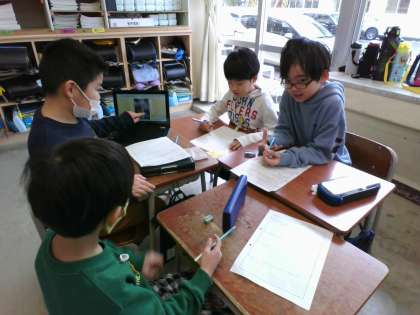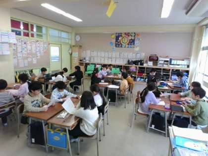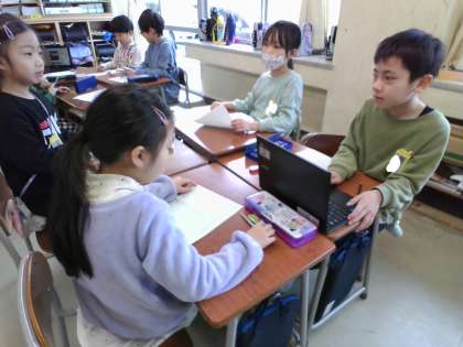 来週、3年生にインタビューに行く2年生。3年生の教科書、時間割、ホームページなどを見ながら知りたいことを考え、グループでどんな質問をするか話し合いました。