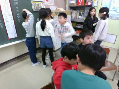 議題が入ったので、学級会(クラス会議)を開きました、 解決策を考える時間には、議題を出した友達に質問に行ったり、「どうしたらいいかな」と友達と相談したり、議題を解決するにはどうしたらいいかを考えていました。