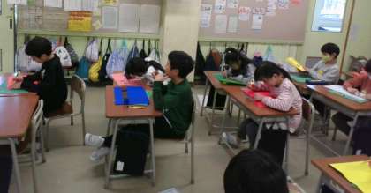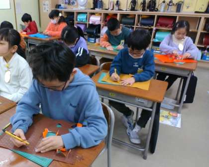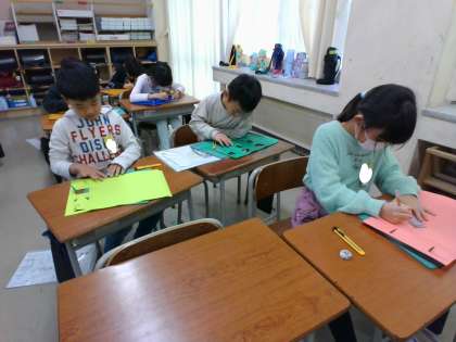 図工で、カッターで開けた窓から何が見えるかを想像して制作をしています。はじめは怖がりながらカッターを使っていた子供たちですが、だんだんと上手に使えるようになってきました。